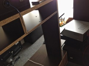 In order to have proper placing of the surround speaker I had to move a CD board from one side of the couch to the other. Being lazy I thought to „walk“ it there with all discs still in it. Bad idea, the back wall couldn’t contain the weight of all the discs an thus loosed itself from its fixation.