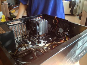 This image shows the whole system assembled. As you can see there’s much less room in the CPU area than before. Compare this to the last image of the Hardware section. Even though there’s the drive bay missing you can see the difference.