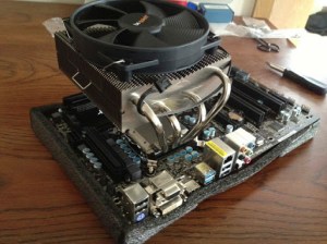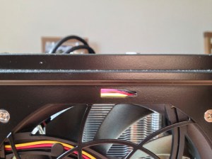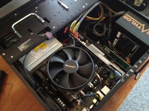 The case came with three 120 mm fans already mounted. Two of them were at the bottom pulling air in and one on the right side of the case pulling air in. SilverStone claims this creates so much pressure inside the case that it prevents from dust depositing. I moved one fan from the bottom to the side of the case to pull air from the CPU and blow it out of the case. Look at the first picture again and you’ll see that the CPU cooler blows air to the fans on the side. This should help to get the hot air out of the computer as fast as possible.