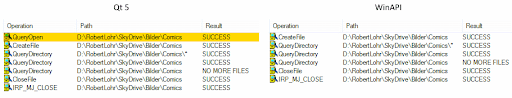 Looking at the actual physical access through ProcessMonitor shows that both implementations (WinAPI and Qt) generate an almost identical output. In order to not be overwhelmed by the sheer amount of data that ProcessMonitor would generate, I chose a single directory with only one file inside for demonstration purposes. The only difference between Qt and WinAPI is the QueryOpen call made by Qt.