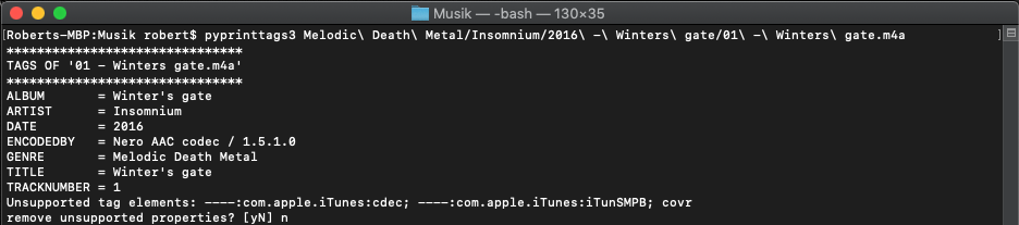 As you can see, it’s prompting if it should remove unknown tags. You can forego this prompt by adding the -b/–batch command line option. Then it’ll just print the tags.