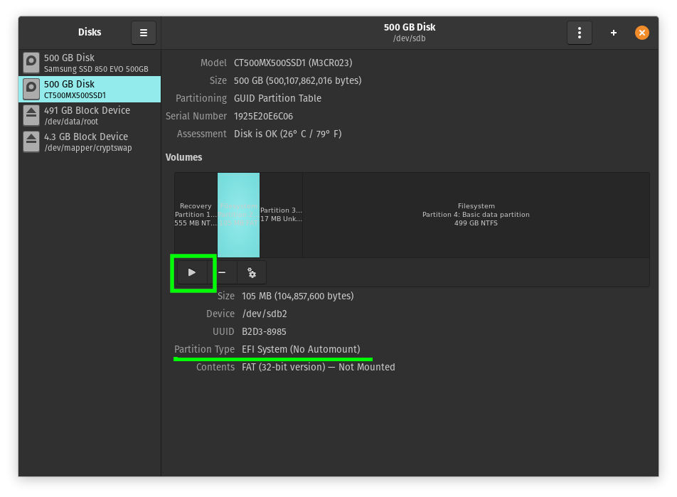 If you are CLI wizard do your thing, I will be using a convenient UI for the first step. Open “Disks” and locate the Windows 10 EFI partition. It’s around 100MB in size. Once you have found it, click the “Play” button to mount it.