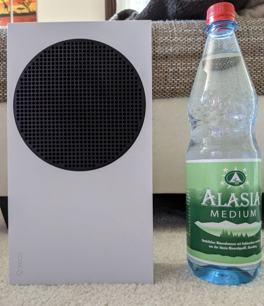 I am a big fan of Small Form Factor PCs, and this tiny box is totally in my wheelhouse. I love the size, and I am happy that Microsoft designed it for vertical use, as you can see in all the promotional images and horizontal use. From past experiences with a WD MyBook external hard drive, I know that I would most certainly knock it over if I were to use it in a vertical orientation. It is so thin, about the thickness of a 1L German water bottle, that it does not take much force to topple it over. Be aware of that if you have a pet and the console is within reach.