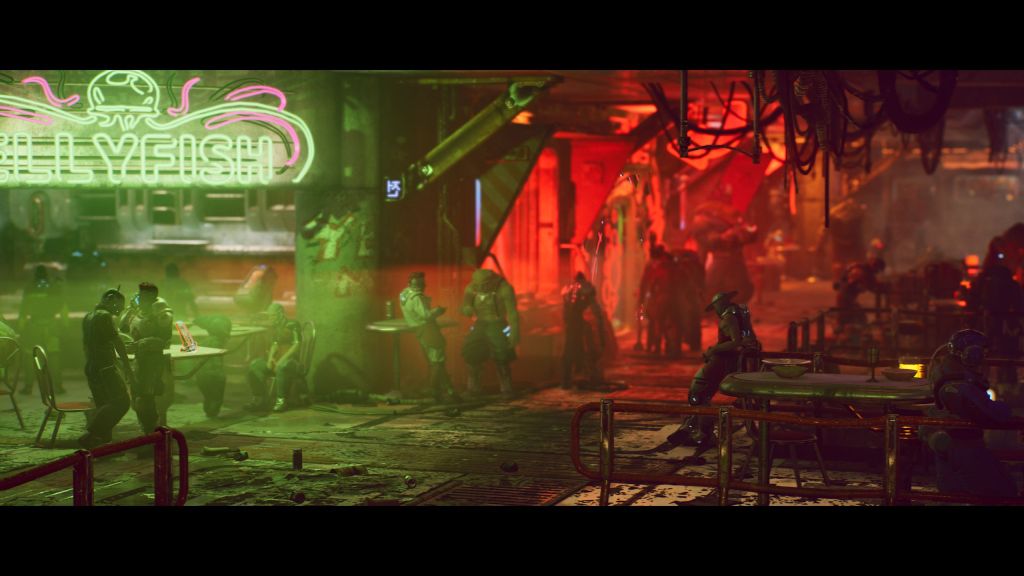 The Ascent does not rely on fancy effects alone. The world is full of small details and incredibly densely populated. There are people and debris almost everywhere you look. Nothing feels empty – except the only clean place I just mentioned. In some locations, you can even get pretty impressive vistas. There is more to it than what is right in front of you. Take a look at the background and enjoy the level of detail the developers have put even there. The game’s world is chock-full of stuff, making it so much more appealing visually and believable in what it wants to be. Life in the world of The Ascent is arduous and dangerous. As the trailer says, workers are slaves in everything but name, and the visual presentation undermines that claim.