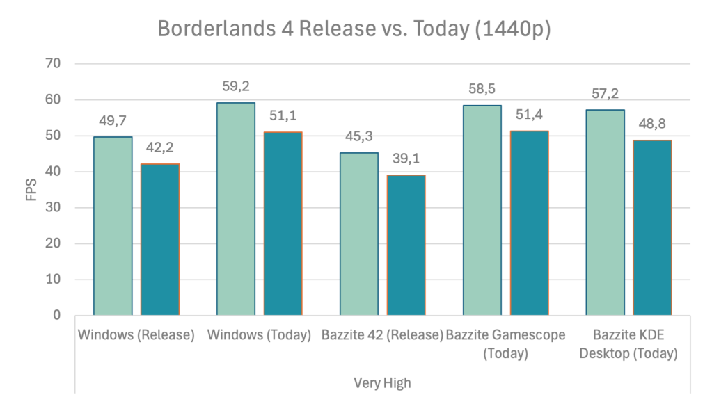 When we compare the results from launch with today, we can see two things. Gearbox did, in fact, improve the game’s horrendous performance. Maybe drivers also play a role, but we gamers don’t care. Linux and Windows are basically on par now.