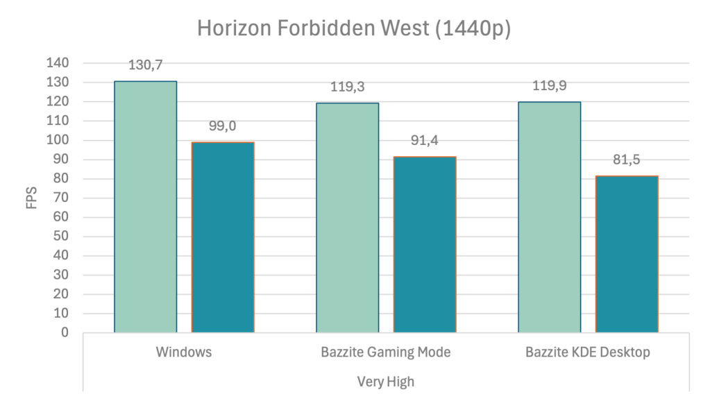 Long story short: With the Very High preset and quality upscaling, Windows barely leads Linux by 10 FPS. That corresponds to roughly 10% on average and falls within the run-to-run variance range in the 1% low department.
