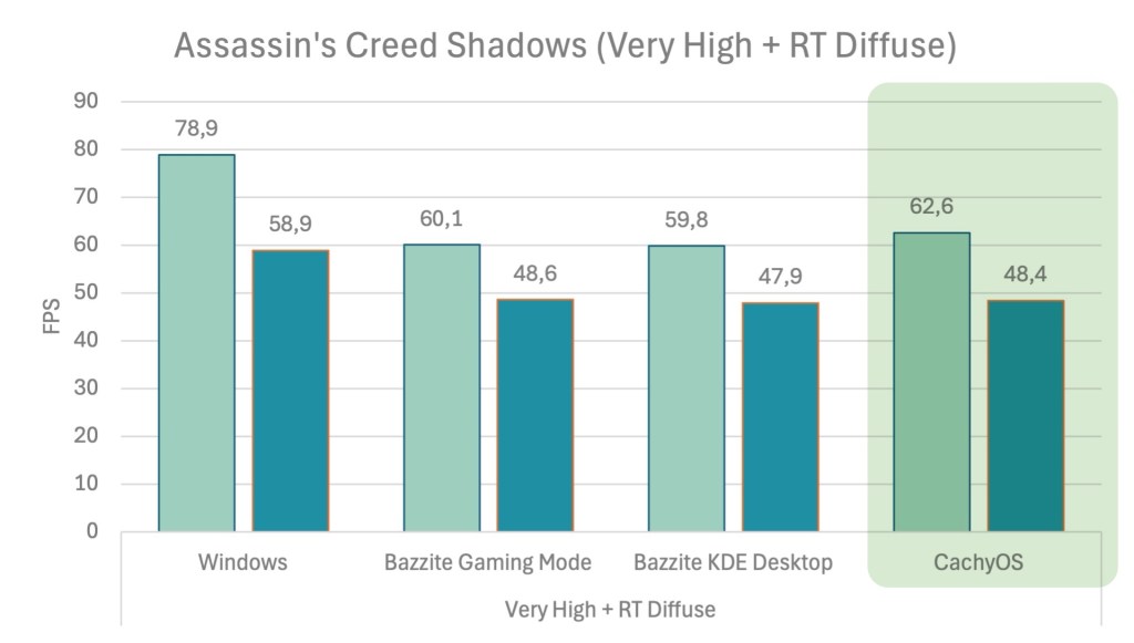 The results in AC Shadows are deflating. If any game was in desperate need of a performance boost, it was this one. CachyOS can improve the average framerate compared to Bazzite’s Gaming Mode by 4%. And that’s about it.