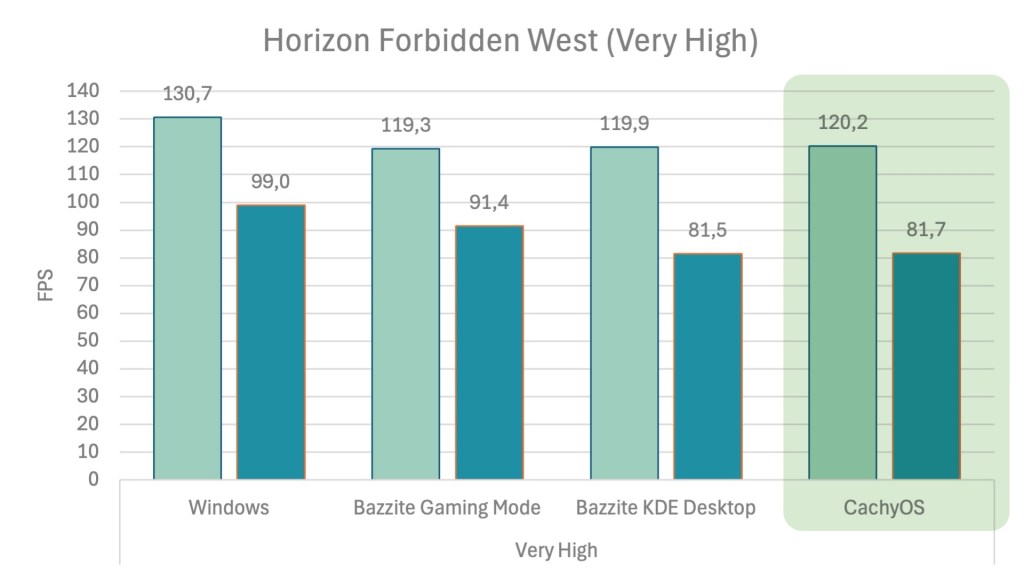 Aloy’s colorful world isn’t a problem for CachyOS either. Its performance is on par with Bazzite’s KDE desktop mode. That means the average framerate hovers around 120 FPS, whereas the 1%-lows have a hard time keeping up with Bazzite’s Gaming Mode. Cachy trails by 10%. Whatever black magic the Gamescope session employs, it works so much better than the highly optimized CachyOS.
